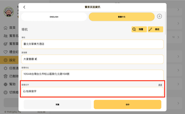 - 例如,將婚禮標題從 “心怡與俊宇” 更改為 “心怡 & 俊宇的大日子”,然後點擊“預覽”按鈕查看修改內容。